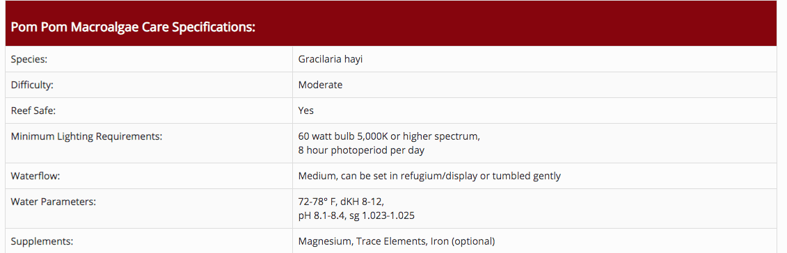 Also known as Red Bush algae, the Pom Pom macroalgae is a red algae which can be placed inside a refugium or kept in the main display tank. This type of algae will be a welcomed snack by herbivorous fish, so if you may want to keep it in a refugium if you have these fish.