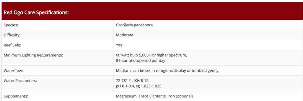 Perhaps my favorite macroalgae is the Red Ogo. This algae is very colorful with a mix of red and burgundy. It looks great in any reef tank and has short bushy fronts that can be pointy on the tips. The Red Ogo is a very hardy algae that will grow fast under the right lighting conditions.
